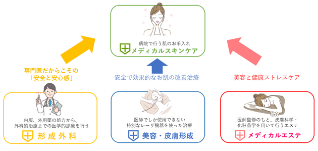 当院2F「形成外科」では、医療機関でしか使用することができないレーザー機器や薬剤、メディカルコスメタントといわれる医師のみが使用できる「アンチエイジング」成分を高濃度に配合した化粧品を使用し、気になるお肌のシワ・たるみ・くすみ・ニキビ・あざ・ほくろ・いぼ・傷あなどの治療から、脱毛まで「病院で行うメディカルスキンケアで、より安全で、より効果的に」をテーマに皮膚のアンチエイジング(抗老化)から、アクティブエイジング(明日は今日より美しく)を目標に治療を行っています。